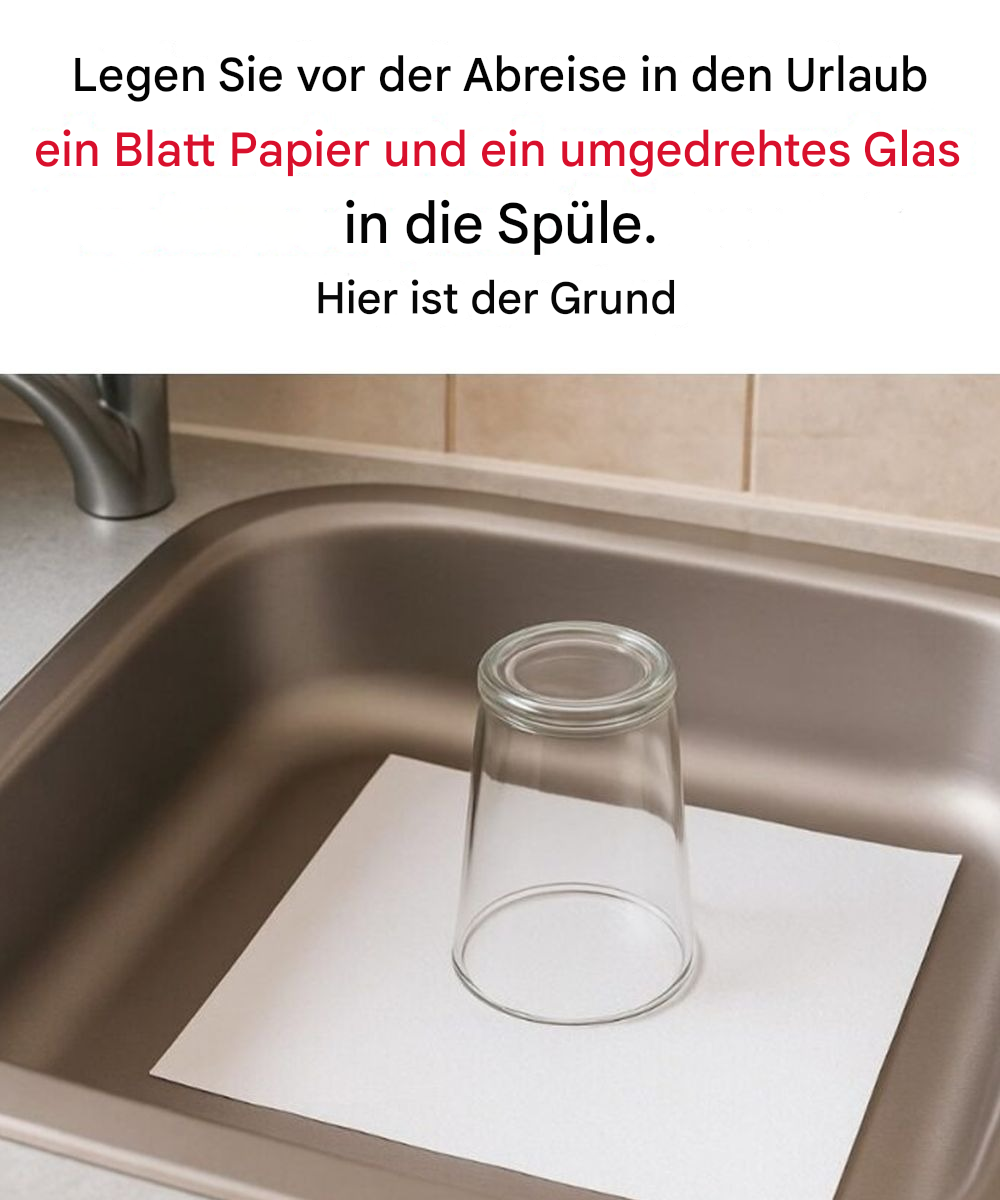 Darum sollten Sie vor dem Urlaub immer ein umgedrehtes Glas und ein Stück Papier in der Spüle liegen lassen