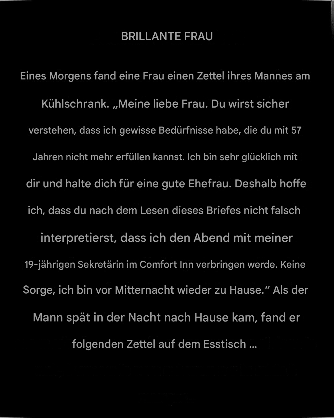 Stellen Sie sich vor, Sie wachen eines schönen Morgens auf und finden einen achtlos am Kühlschrank geklebten Zettel Ihres geliebten Ehepartners. Er entfaltet sich wie ein tröstender Brief, doch die Wendung lässt Sie Ihren Morgenkaffee ausspucken. Genau so beginnt unsere Geschichte: Eine Frau entdeckt einen Brief ihres Mannes. Er lautet in etwa so: