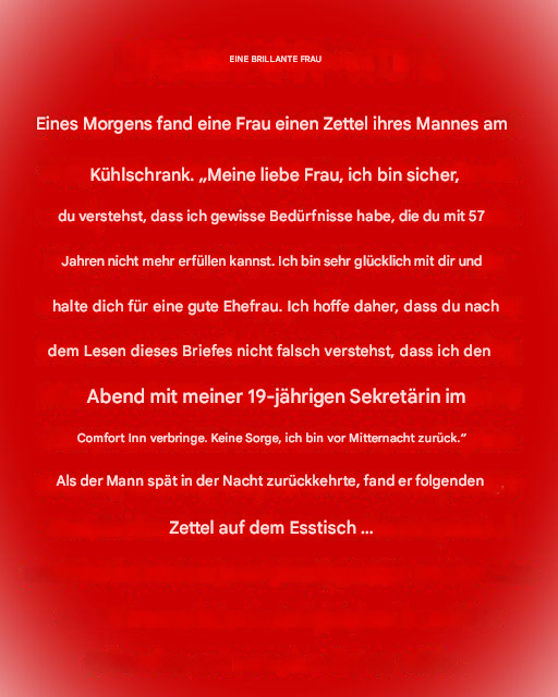 Ich hoffe, Sie verstehen nach dem Lesen dieses Briefes nicht falsch, dass ich den Abend mit meiner 19-jährigen Sekretärin im Comfort Inn verbringen werde. Keine Sorge, ich bin vor Mitternacht zurück.