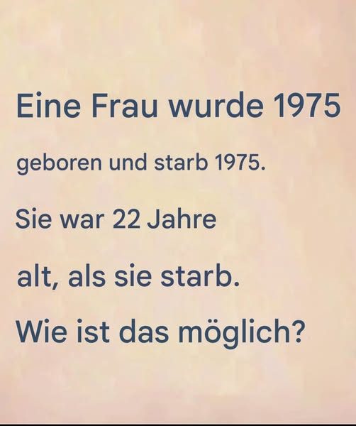 Stellen Sie sich vor: Beim Scrollen durch Ihren Newsfeed stoßen Sie auf diesen seltsamen Satz: „Eine Frau wurde 1975 geboren und starb 1975. Sie war 22 Jahre alt.“ Er lässt Sie erstarren. Unverständlich? Beunruhigend? Offensichtlich gibt es irgendwo einen Haken … Aber wo? Halten Sie sich fest, denn dieses Rätsel stellt unsere Logik, unsere Reflexe und eine Prise Fantasie auf die Probe. Was wäre, wenn der Schlüssel gerade darin läge, anders zu denken als gewohnt?