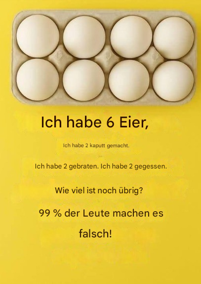 „Ich habe 6 Eier. Ich habe 2 zerbrochen. Ich habe 2 gebraten. Ich habe 2 gegessen. Wie viele Eier fehlen mir?“